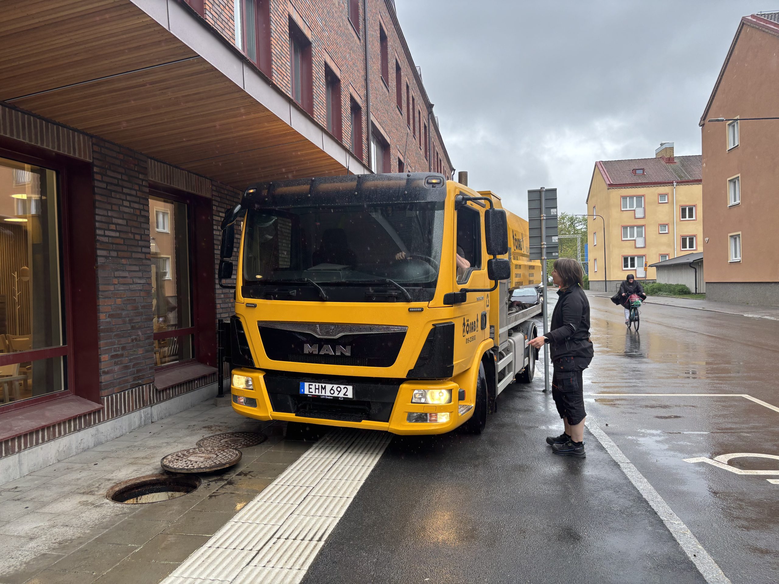 Väl vid familjecentralen är det en hyresgäst som undrat varför kylen inte fungerar som den ska. Cecilia kontrollerar den och konstaterar att kylslingan stänger av för snabbt.